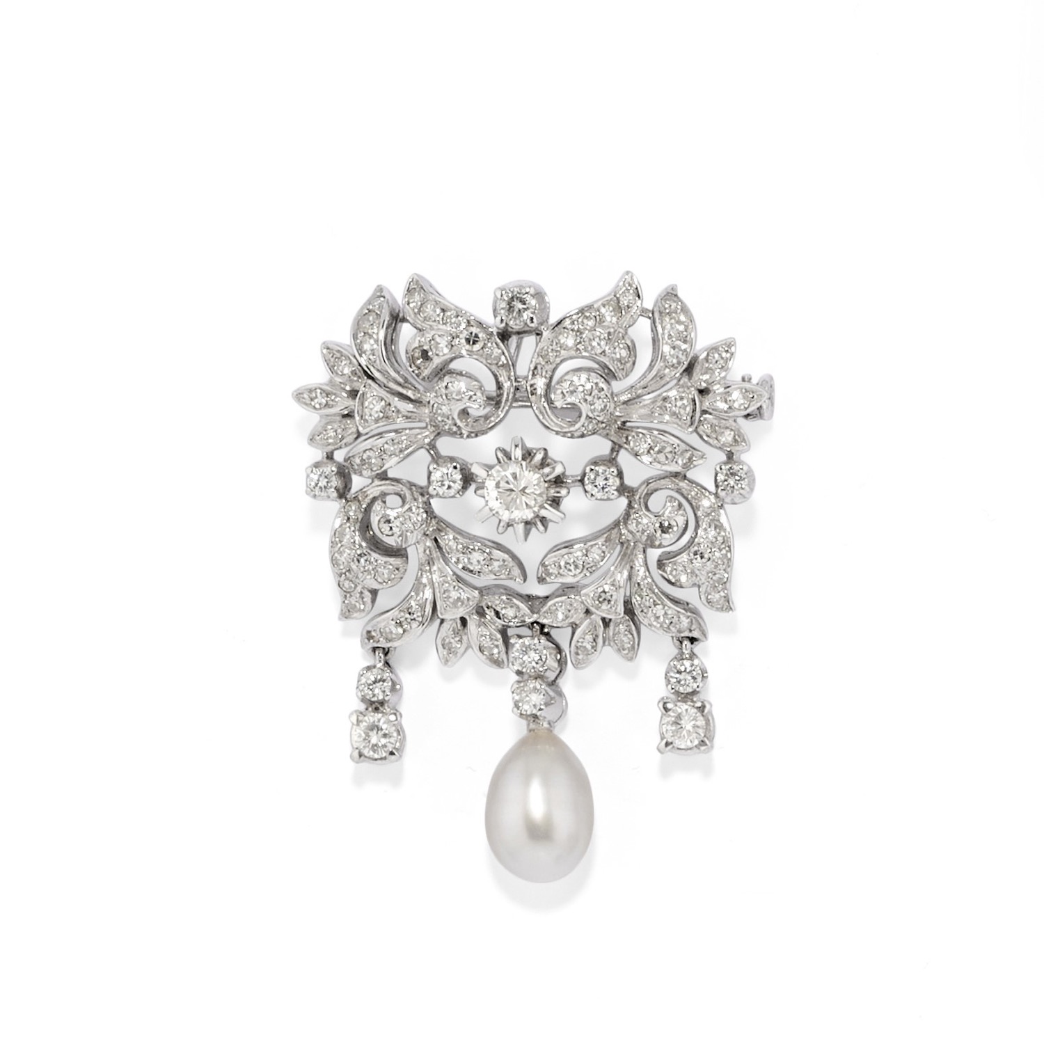 a disegno fogliaceo, decorata da diamanti taglio brillante e huit-huit e tre pendenti con diamanti taglio brillante e perla di forma ovale.
