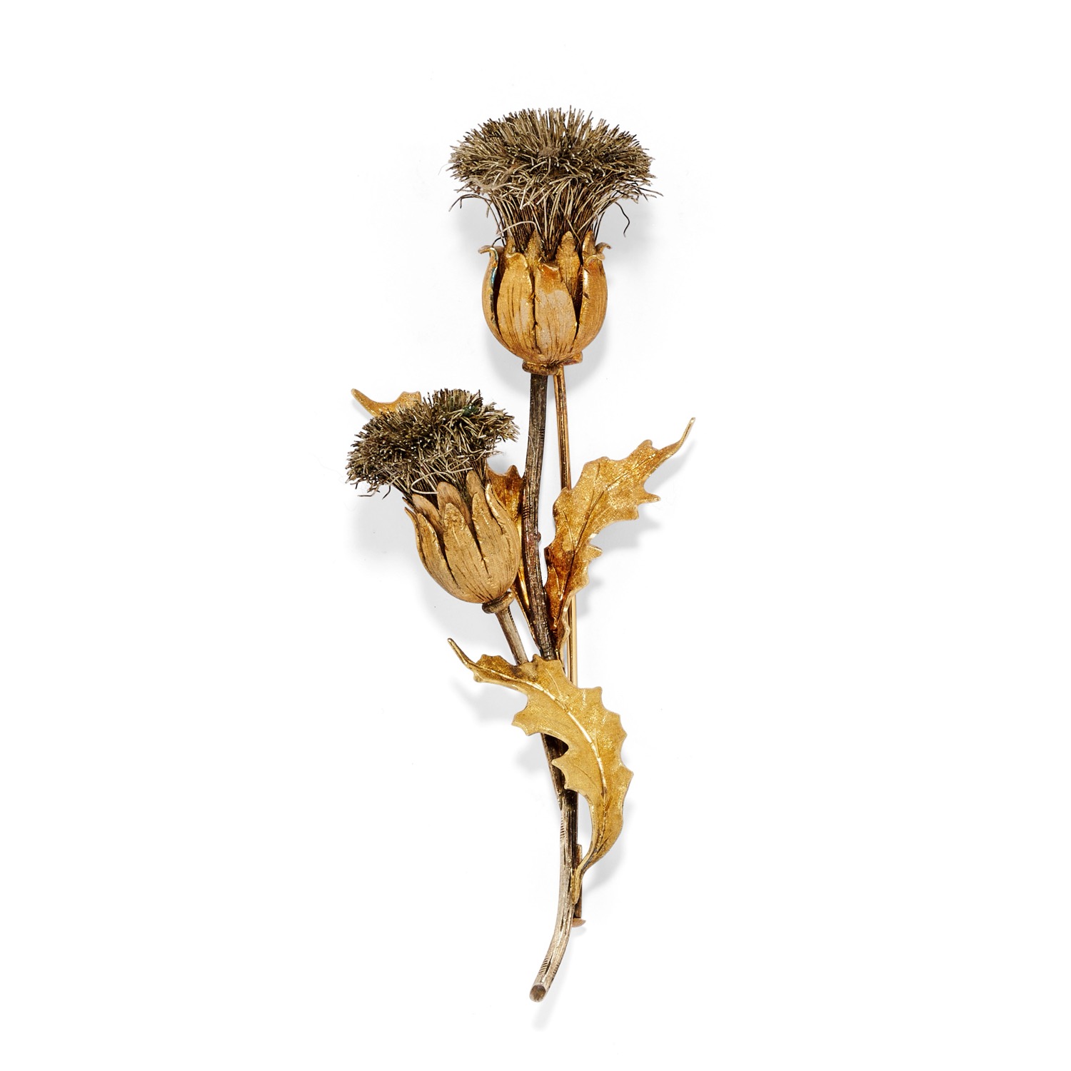 raffigurante fiori di cardo con lavorazione incisa, firmato M. Buccellati.