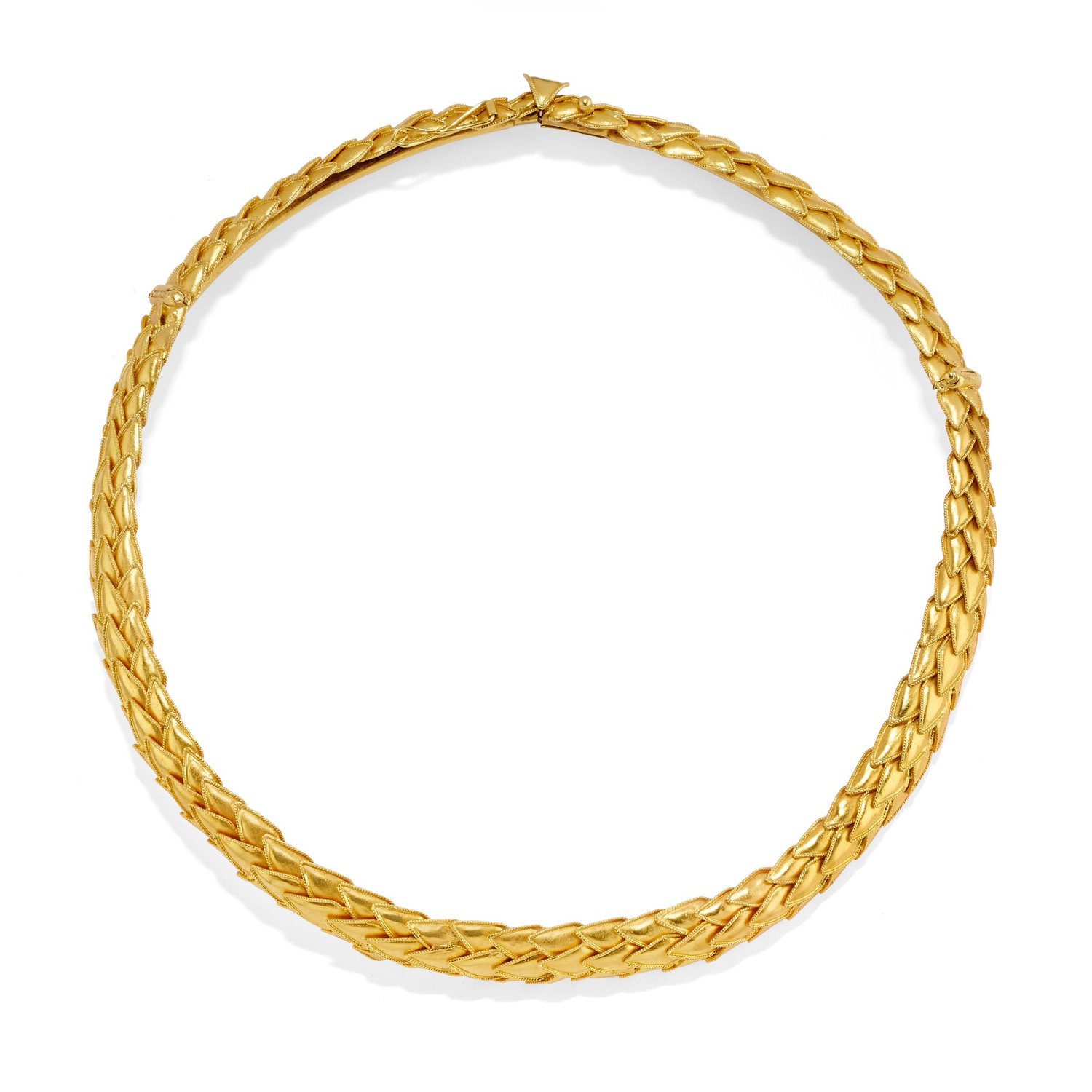 a girocollo, semirigida, lavorazione con foglie a rilievo e profilo a cordoncino.