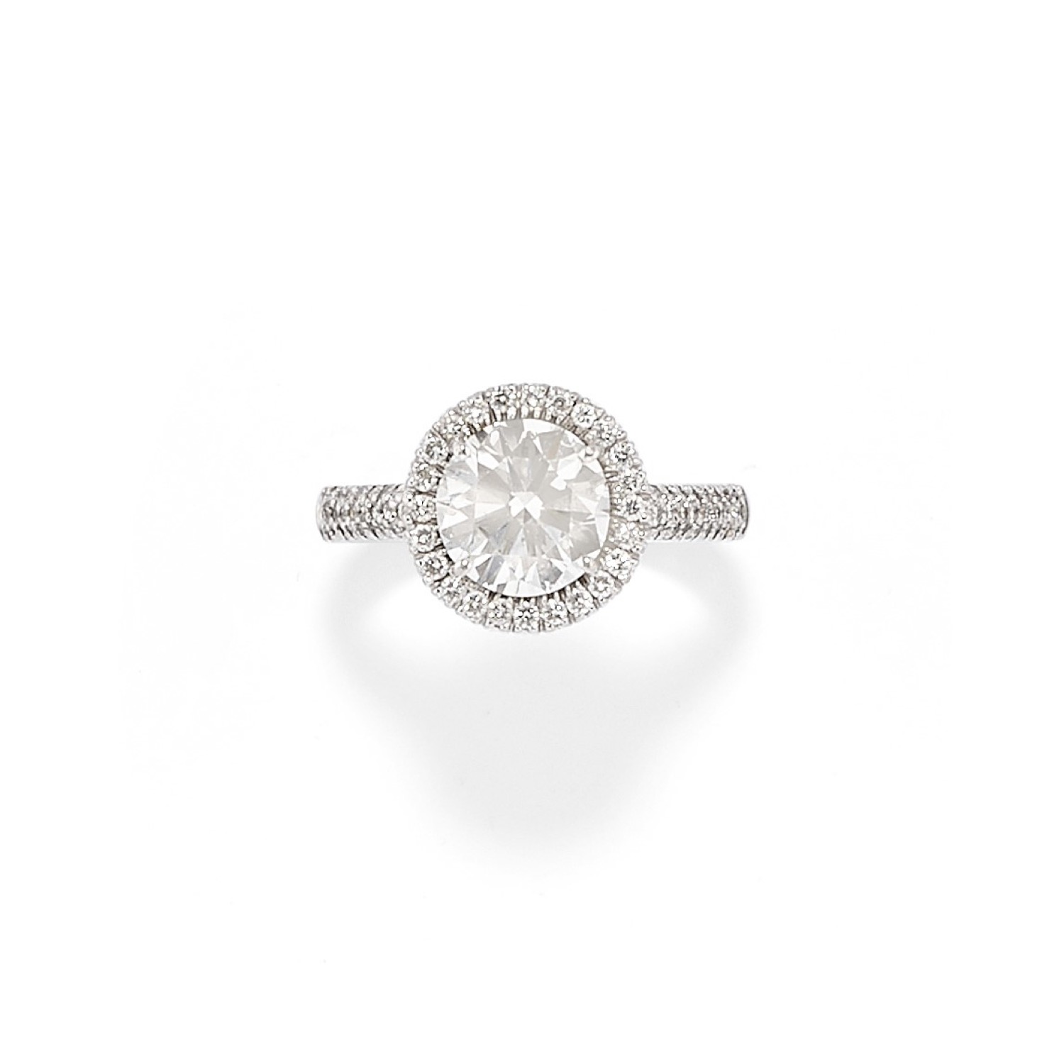 al centro diamante taglio brillante di ct 1,72 (caratura incisa) colore D purezza SI2 (incisi) decorato da diamanti taglio brillante per totale ct 0,33 (caratura incisa).