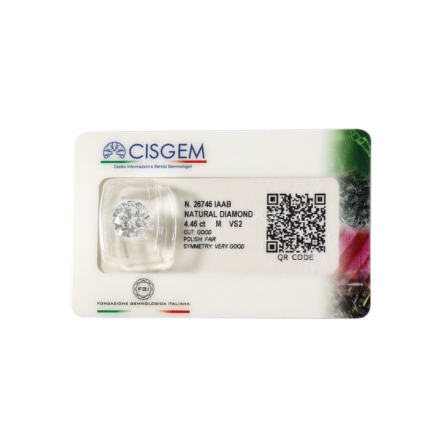 taglio brillante di ct 4,46, colore M, purezza VS2.taglio brillante di ct 4,46, colore M, purezza VS2.