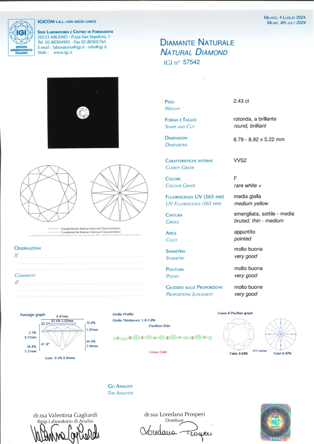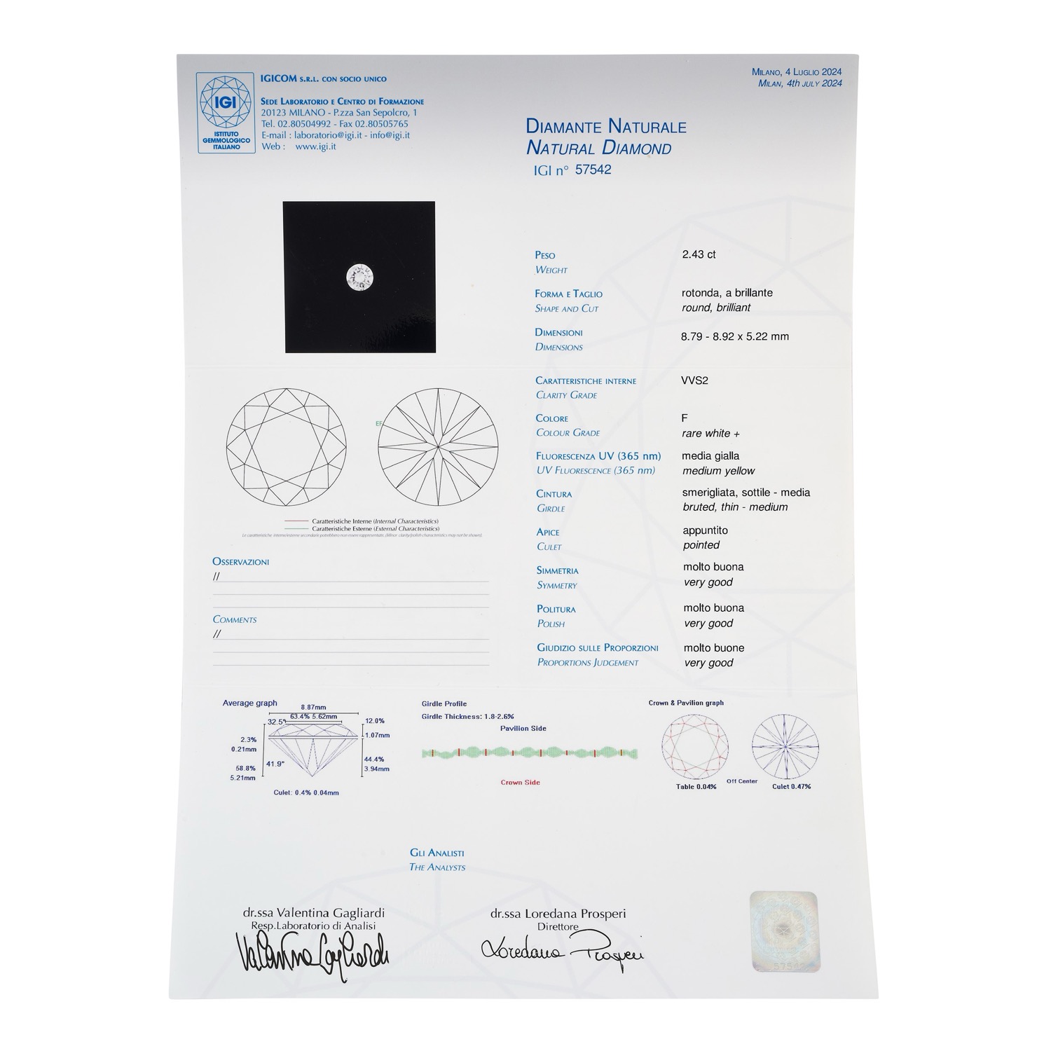 1. diamante taglio brillante di ct 2,43, colore F, purezza VVS2, accompagnato da anello con montatura a quattro griffes in oro bianco 18k. 1. diamante taglio brillante di ct 2,43, colore F, purezza VVS2, accompagnato da anello con montatura a quattro griffes in oro bianco 18k.
