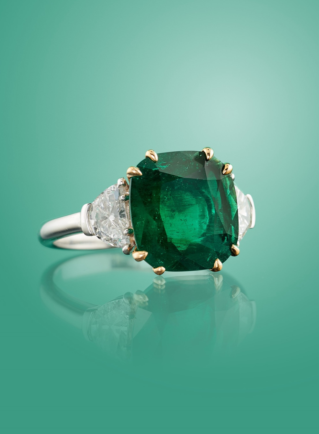 al centro smeraldo Colombia taglio cuscino di ct 4,56 (caratura incisa) e ai lati due diamanti taglio fantasia per totale ct 0,80 (caratura incisa), con scatola e certificato.