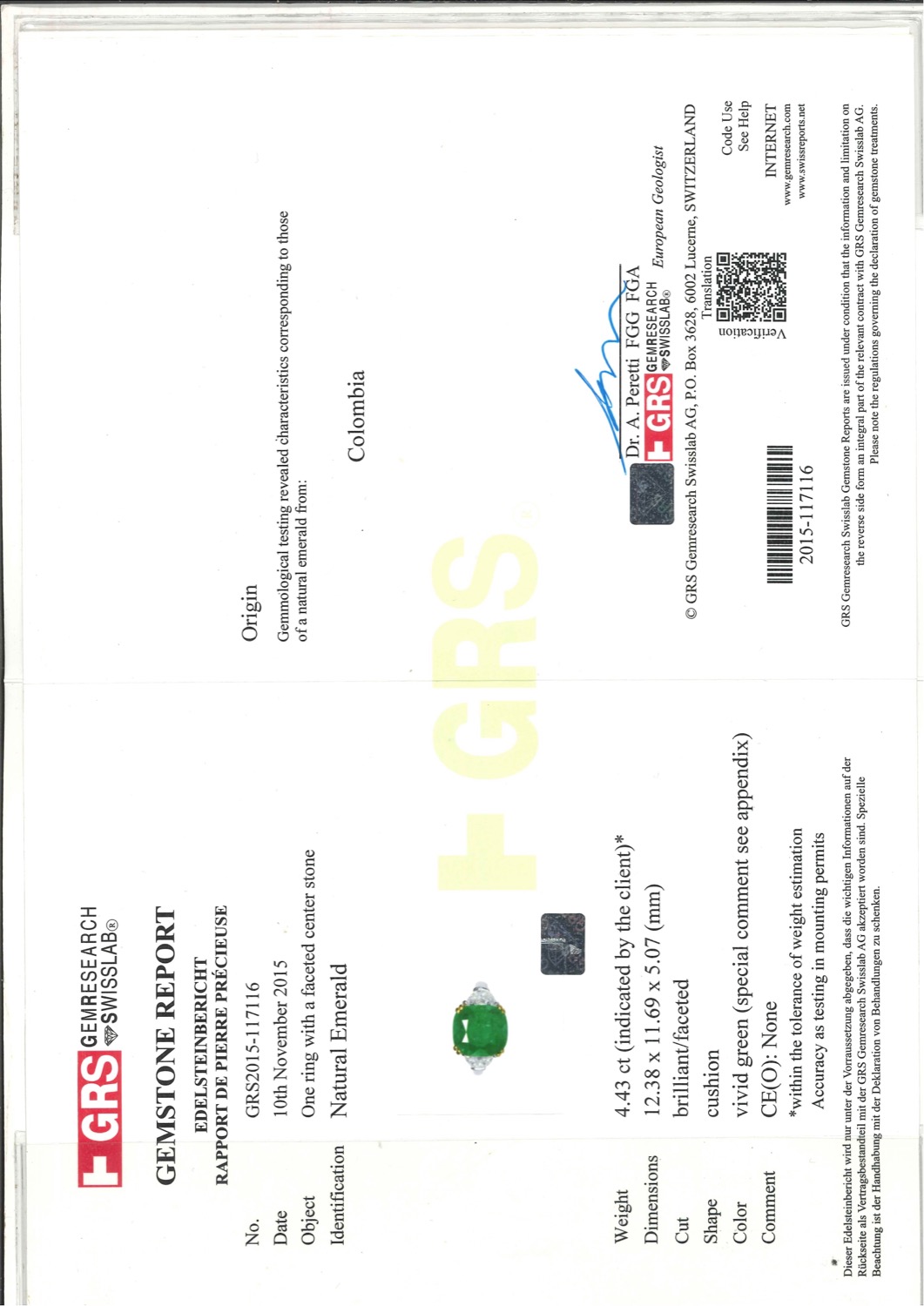 Lo smeraldo è accompagnato da certificato gemmologico n. GRS2015-117116 del 10/11/2015 Gem Research Swiss Lab, Lucerna, Svizzera.