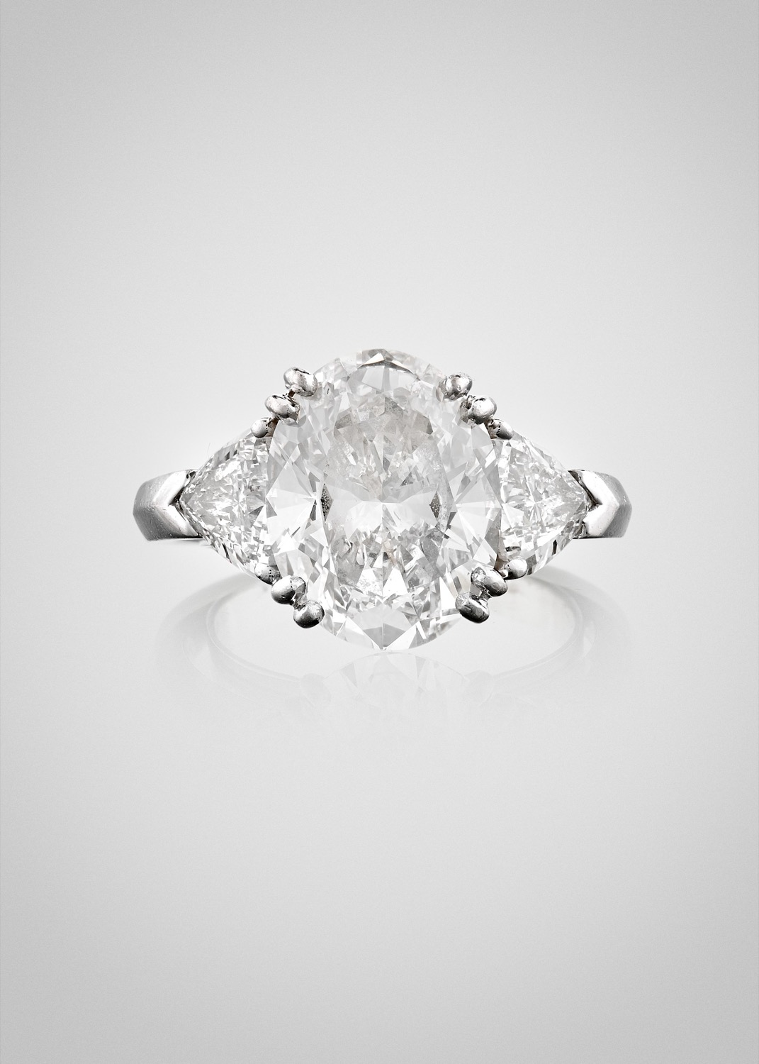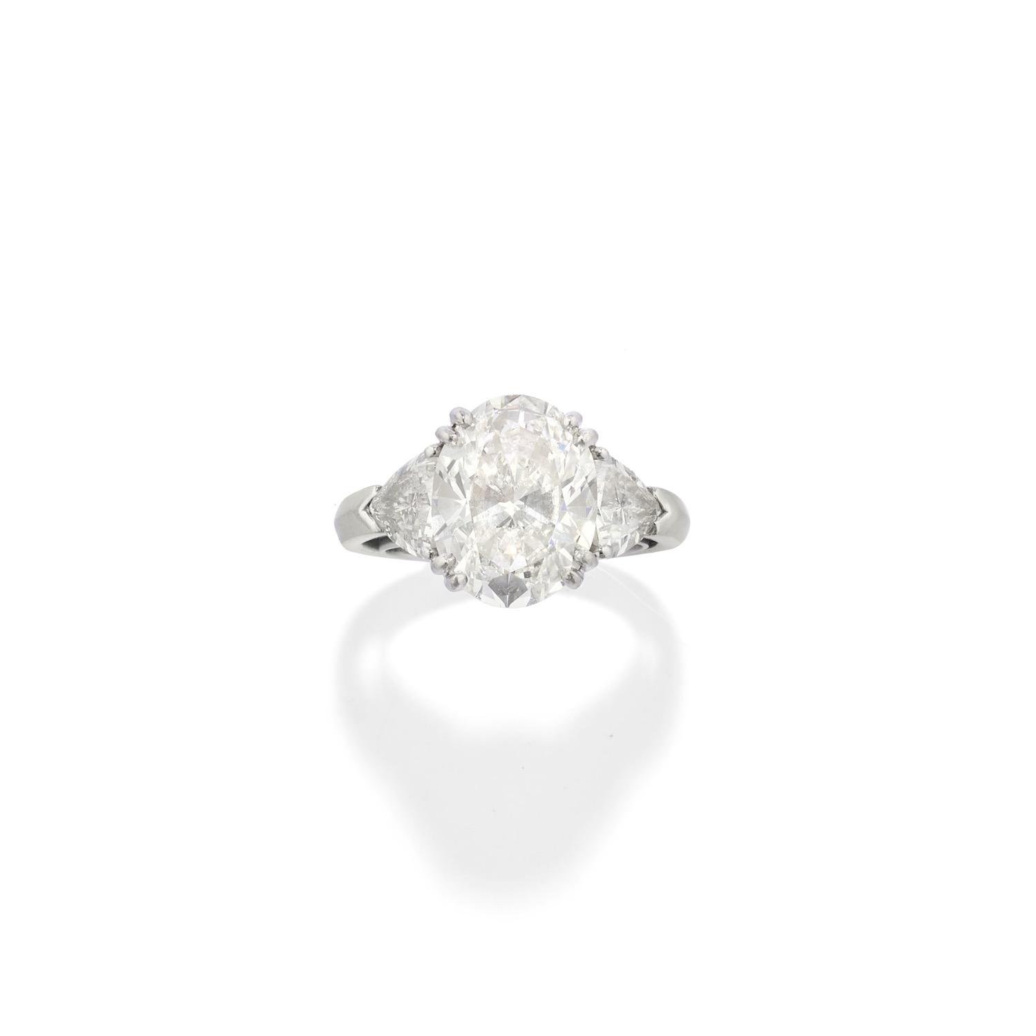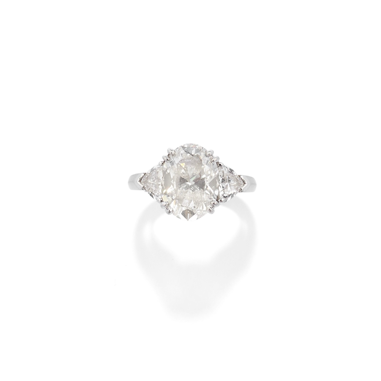 al centro diamante di forma ovale taglio brillante di ct 4,14 (caratura incisa), ai lati diamanti taglio trilliant per totale ct 1,00 circa, firmato Fasoli.