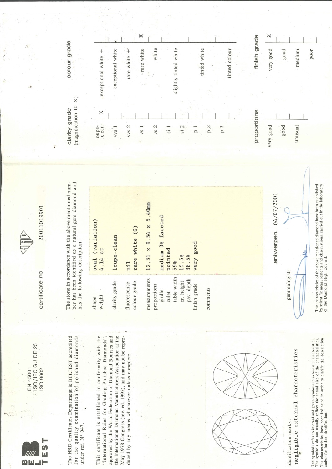 Il diamante centrale è accompagnato da certificato gemmologico n. 20011019901 del 04/07/2001, HRD Anversa.