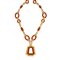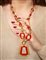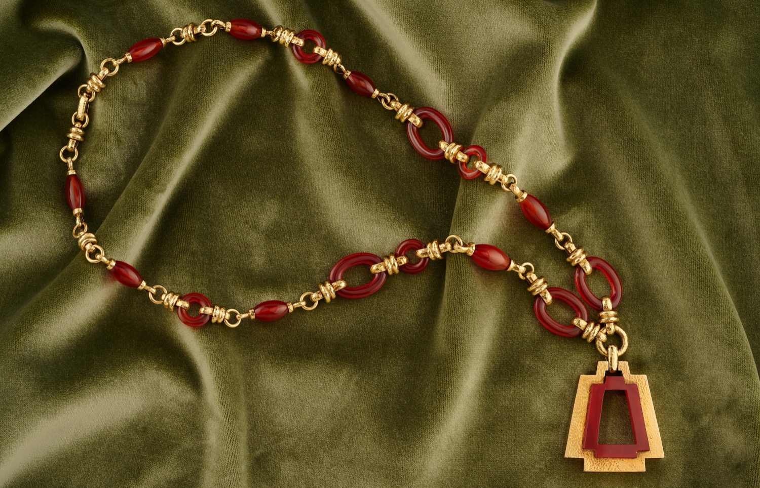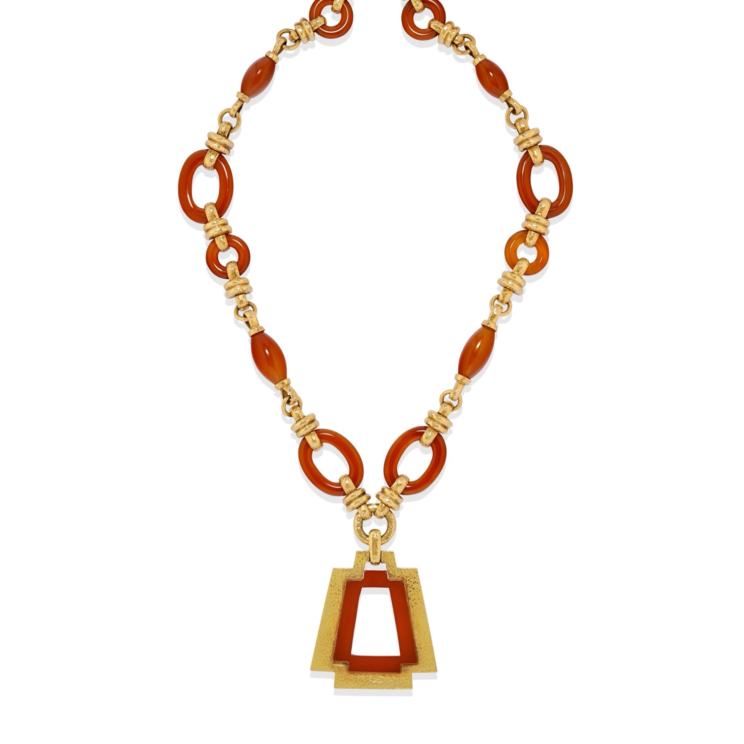 a sautoir, realizzata con maglie ovali e a barilotto in corniola alternate a catena, che trattengono pendente di forma geometrica, a lavorazione martellata.