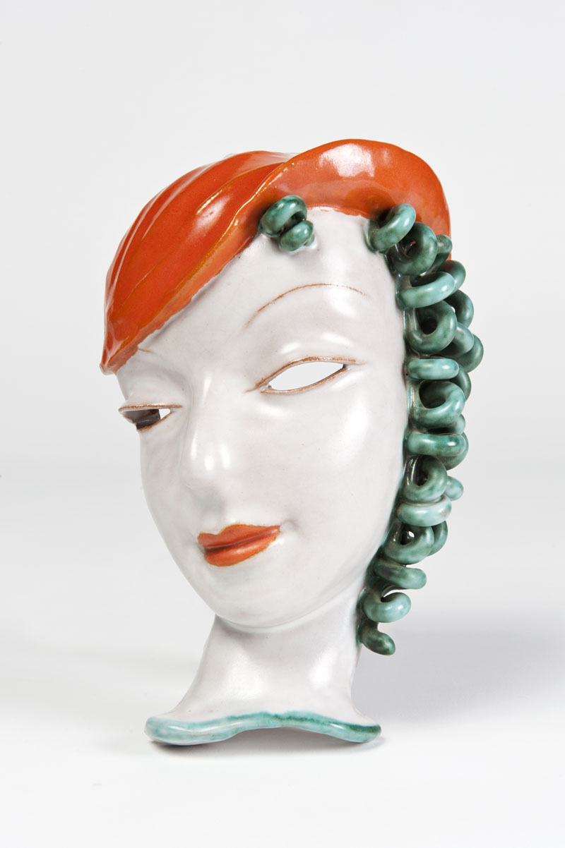 Manifattura Goldscheider, Vienna. Testa da muro in ceramica policroma, anni '30 del sec XX. Marcata al verso con monogramma della manifattura e recante numerale 6428. (h cm 23)