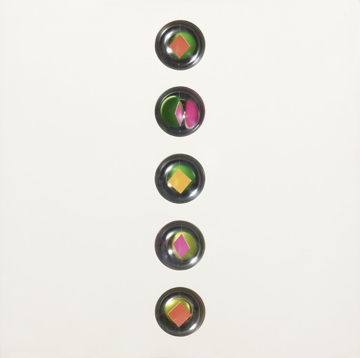 Semisfere in acciaio cromato e cartoncini serigrafati su legno dipinto, cm 70x70x8,5