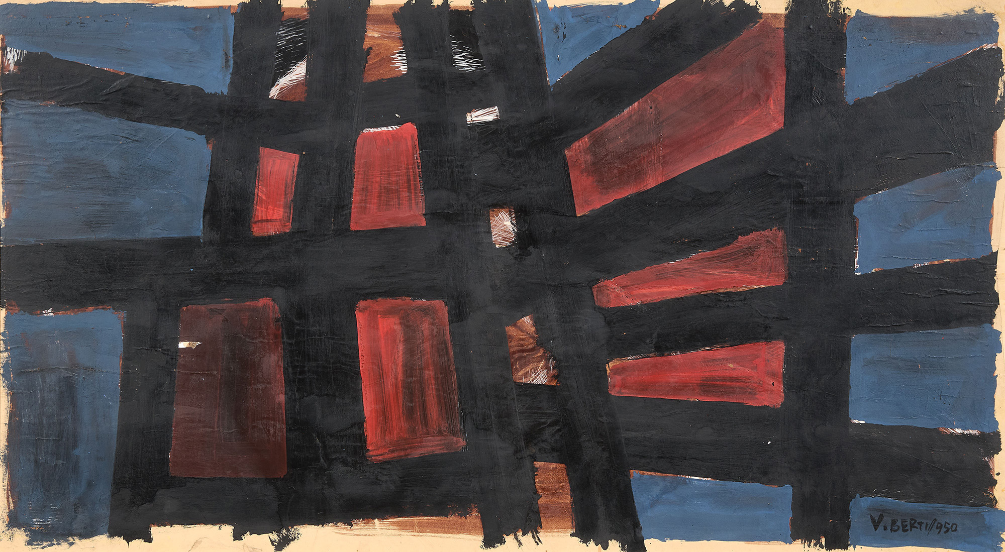 Firma e data in basso a destra: V. Berti 1950; firma, titolo e data al verso sul compensato: Vinicio Berti / "Costruzione" / 1950.