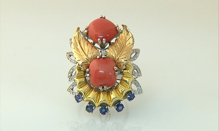 ANELLO. In oro giallo, rosa e bianco 18 kt (trasformabile in ciondolo), sommità a festone con foglie incise, inserti in corallo cabochon, zaffiri taglio rotondo per tot. cts. 1,00 ca. e diamanti taglio brillante e huit-huit per tot. cts. 0,40 ca.