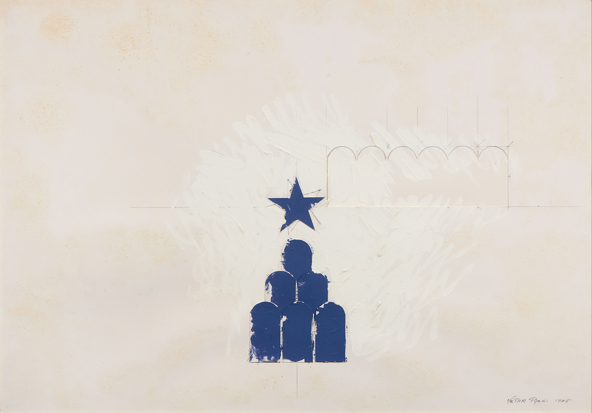 Firma e data in basso a destra: Vettor Pisani 1975. Al verso, su un cartone di supporto: timbro Studio La Torre, Pistoia.