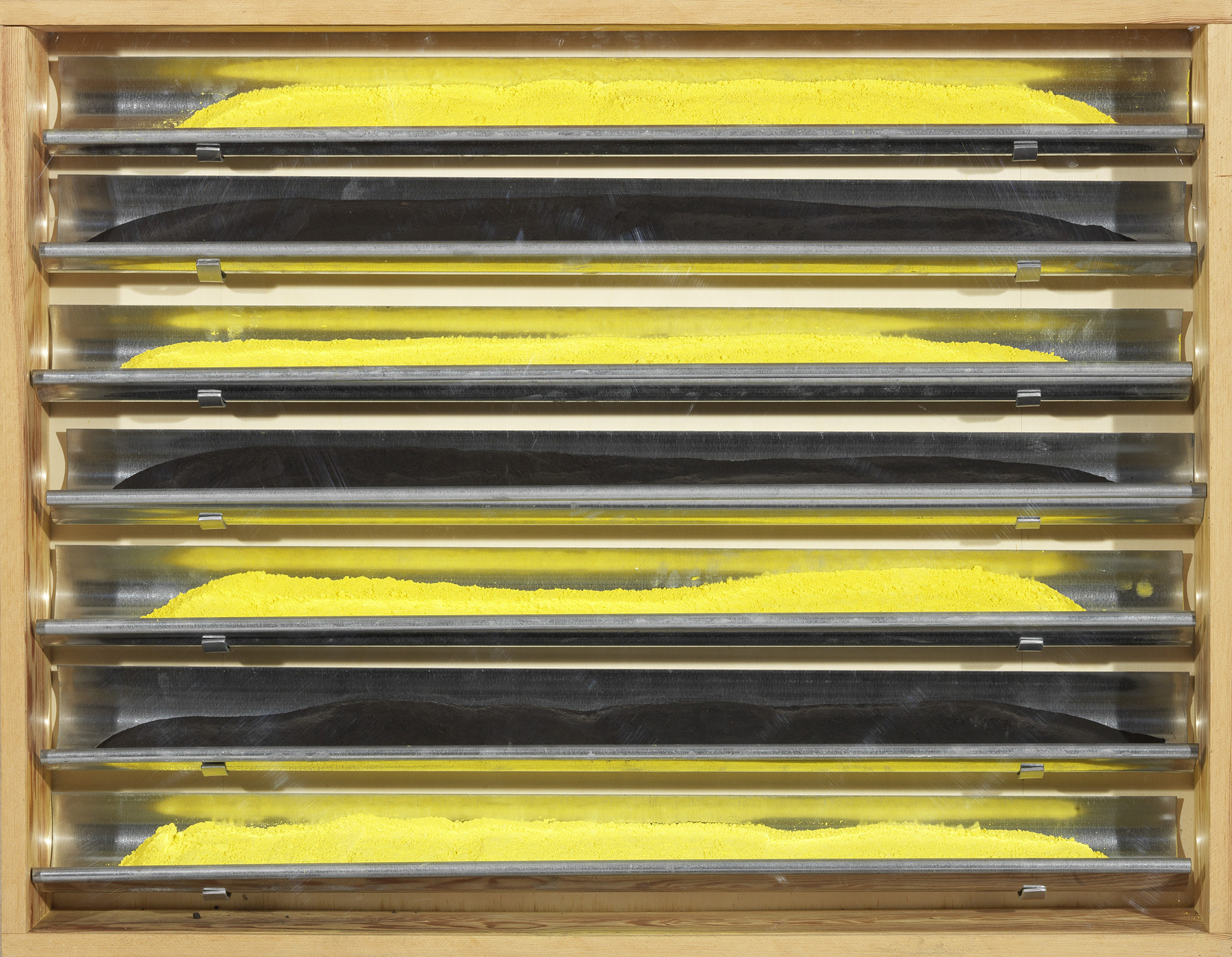 Canali in metallo con terre colorate, assemblaggio, cm 81,5x104,5x14,4 (con teca)