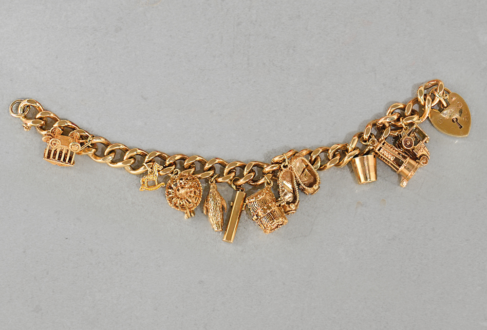 BRACCIALE CHARMS ANNI '40 CA. In oro giallo 9 kt maglia groumette con undici charms di diversa forma e raffigurazione.