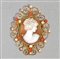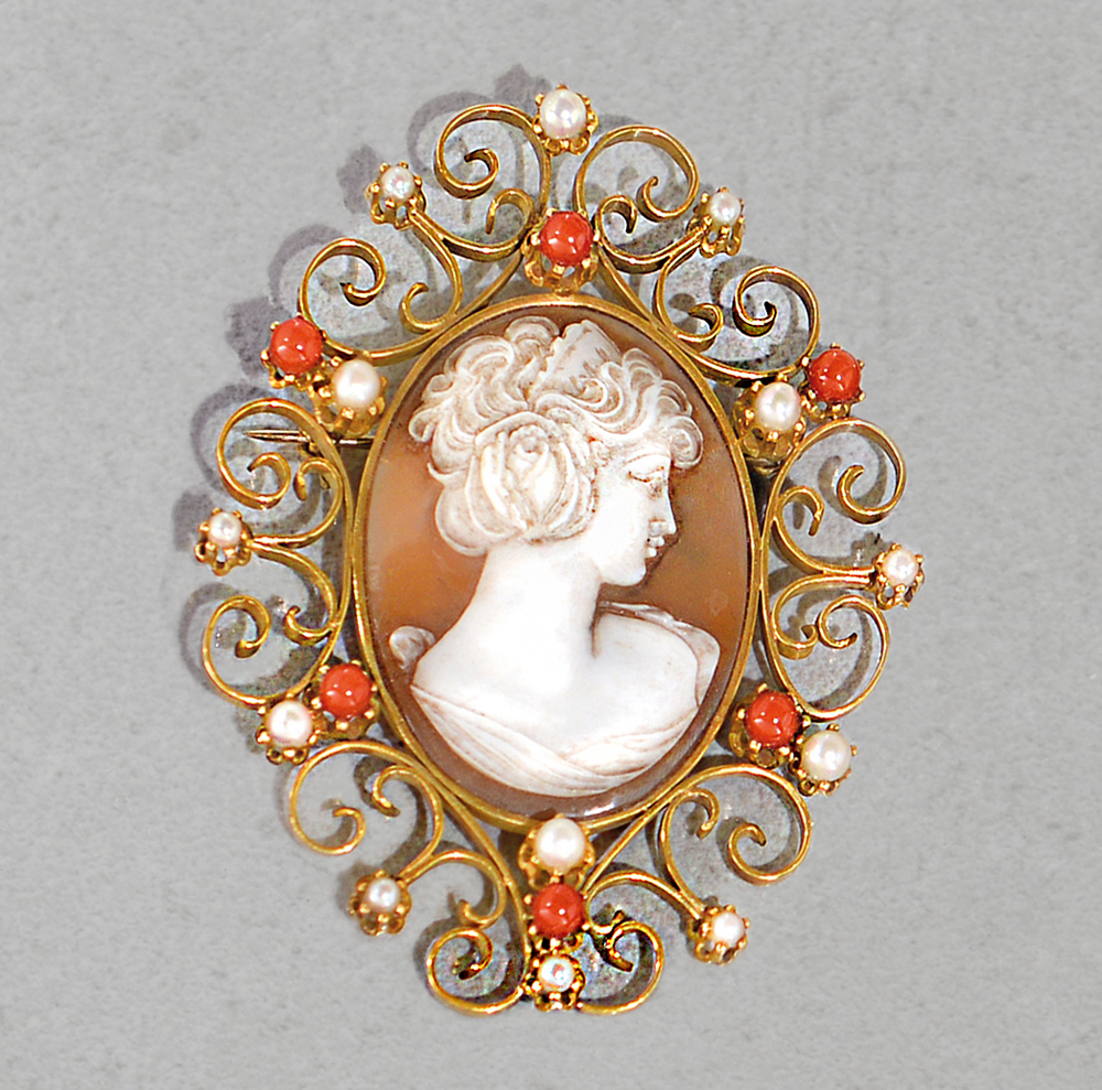 SPILLA. In oro giallo 18 kt, motivi a volute decorati da piccole perle coltivate e boules in corallo con al centro grande cammeo scolpito a profilo femminile.