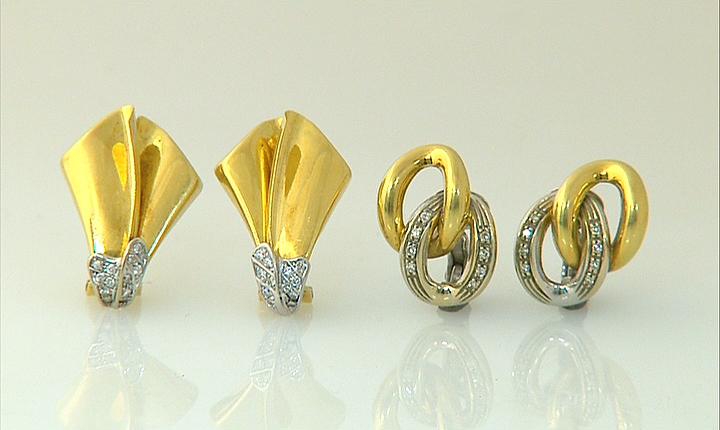 LOTTO DI DUE COPPIE DI ORECCHINI. In oro giallo e bianco 18 kt perno e clip, una con motivi a drappeggio e decori in diamanti taglio brillante per tot. cts. 0,20 ca. ed una a maglia groumette con diamanti taglio huit-huit per tot. cts. 0,10 ca.