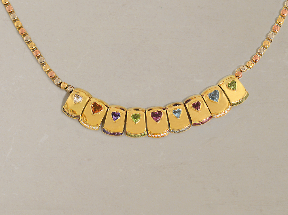 COLLANA. In oro giallo, bianco e rosè 18 kt maglie ad anelli alternati a demiboules con settore centrale decorato da gemme multicolor taglio cuore, brillante e carrè (prob. topazi, tormaline, ametiste, peridoti e quarzi) e diamanti taglio brillante per tot. cts. 0,30 ca.