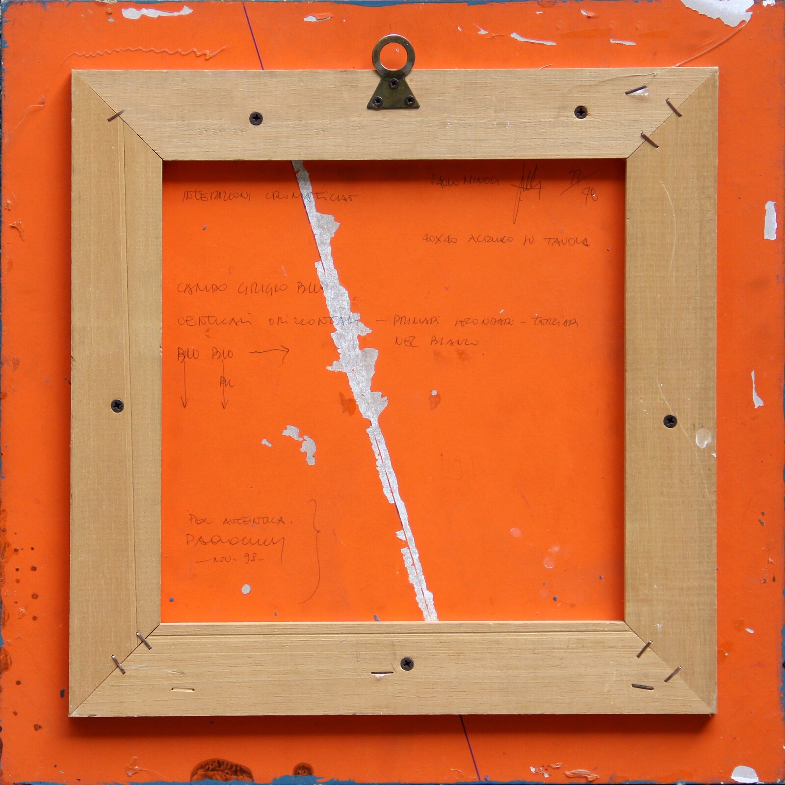 Titolo, firma, data, dimensione, tecnica "Interazioni cromatiche, Paolo Minoli, 77/78, 40x40, acrilico su tavola";