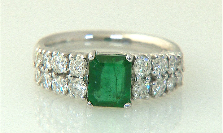 ANELLO. In oro bianco 18 kt con smeraldo taglio rettangolare a contorno ottagonale di cts. 1,60 ca. ed ai lati doppia fila di diamanti taglio brillante per tot. cts. 1,00 ca.