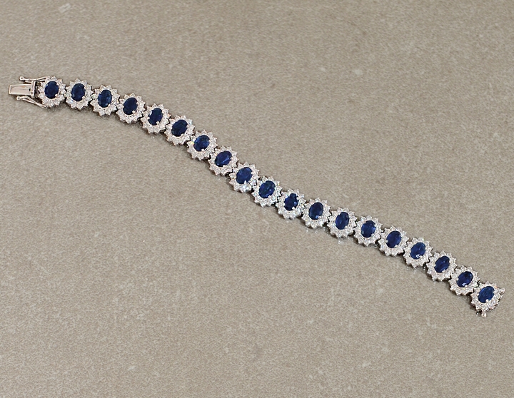 BRACCIALE. In oro bianco 18 kt con settori a fiore centrati da zaffiri taglio ovale per tot. cts. 21,00 ca. entro cornici in diamanti taglio brillante per tot. cts. 9,00 ca.