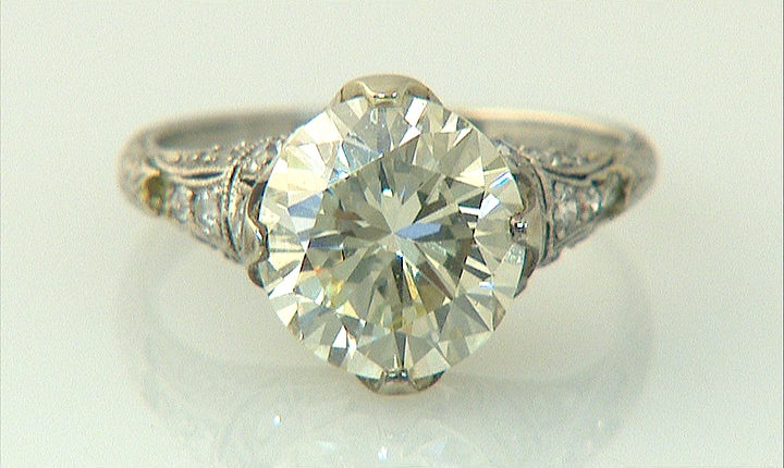 ANELLO. In platino con diamante taglio brillante di cts. 3,00 ca. (prob. colore M/N purezza VS/SI) entro castone tondo a quattro griffes su montatura traforata anni '20 ca. con decori a milligrano ed impreziosita da diamanti taglio huit-huit (uno mancante).