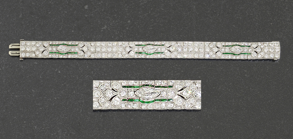 BRACCIALE ANNI '30 CA. In platino a settori incernierati, decoro a milligrano, bordo laterale a giorno, diamanti taglio vecchio e navette per tot. cts. 8,00 ca. e smeraldi taglio rettangolare.