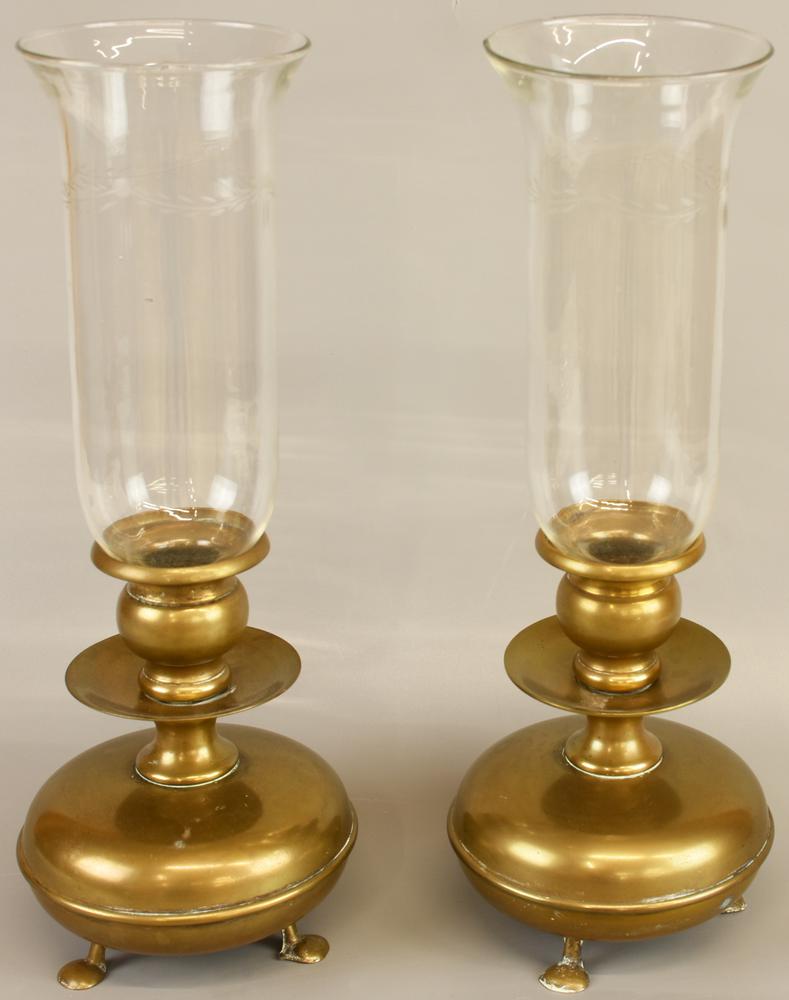 COPPIA DI LAMPADE in bronzo dorato con parte superiore in vetro soffiato e...