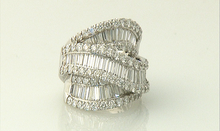 ANELLO. In oro bianco 18 kt a tre fasce con diamanti taglio brillante, baguette e tapered baguette per tot. cts. 11,00 ca. (prob. colore G purezza VS).