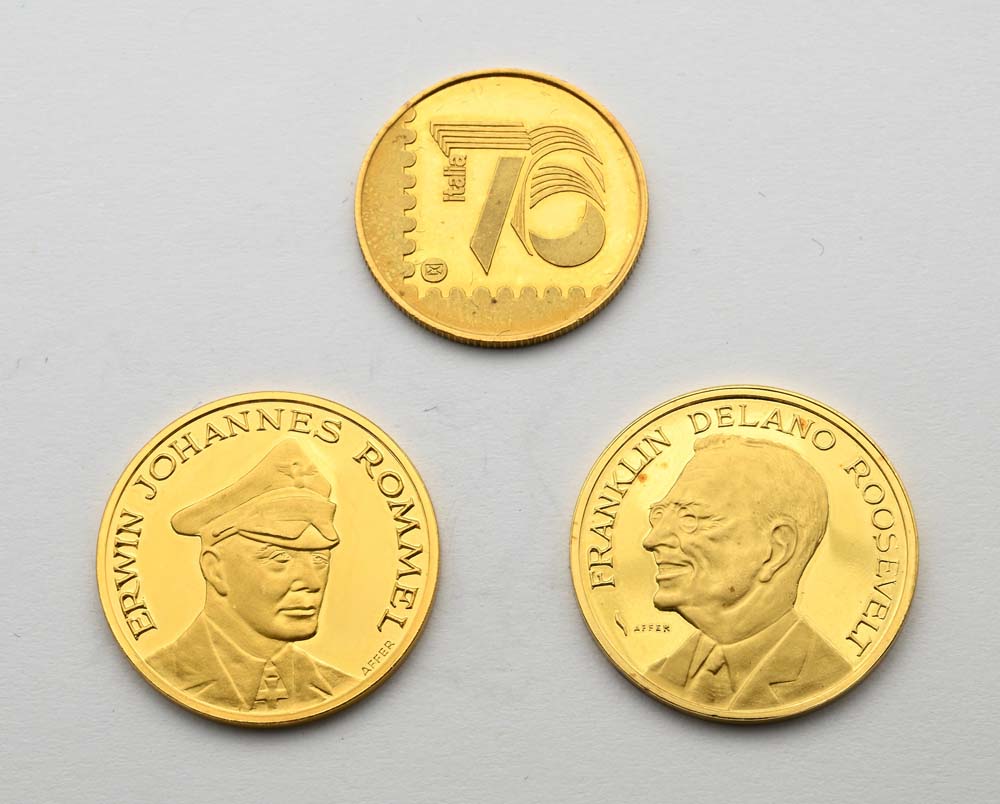 Lotto di 2 medaglie in oro Proof Enciclopedia Numismatica Internazionale (Rommel e Roosevelt) e 1 medaglia in oro Proof Intercoins Italia '76