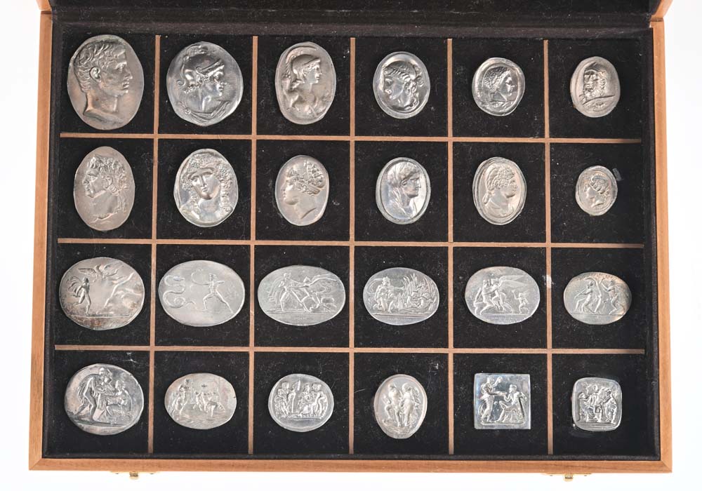 Raccolta di 27 riproduzioni in argento di cammei e pietre dure incise e sbalzate a rilievo di epoca classica e rinascimentale. Entro cofanetto di legno con scomparti rivestiti di velluto