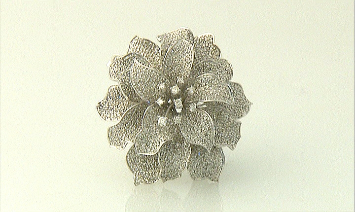 ANELLO. In oro bianco 18 kt a grande fiore con petali sovrapposti e ripiegati interamente impreziositi da diamanti taglio huit-huit per tot. cts. 5,00 ca.