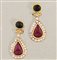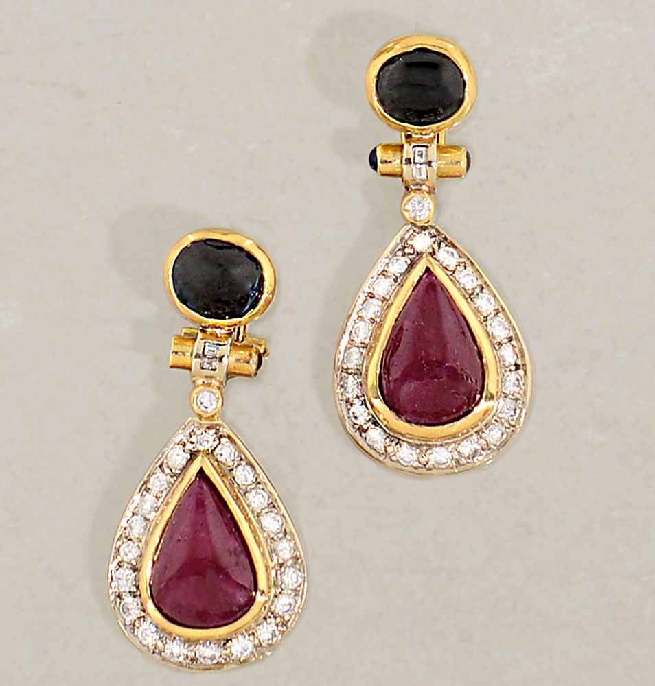 COPPIA DI ORECCHINI PENDENTI. In oro giallo 18 kt perno e clip realizzati a doppio corpo con decori in radici di rubino taglio goccia cabochon di cts. 10,00 ca., zaffiri taglio ovale e rotondo cabochon (uno mancante) per tot. cts. 4,00 ca. e diamanti taglio brillante e baguette per tot. cts. 1,20 ca.