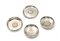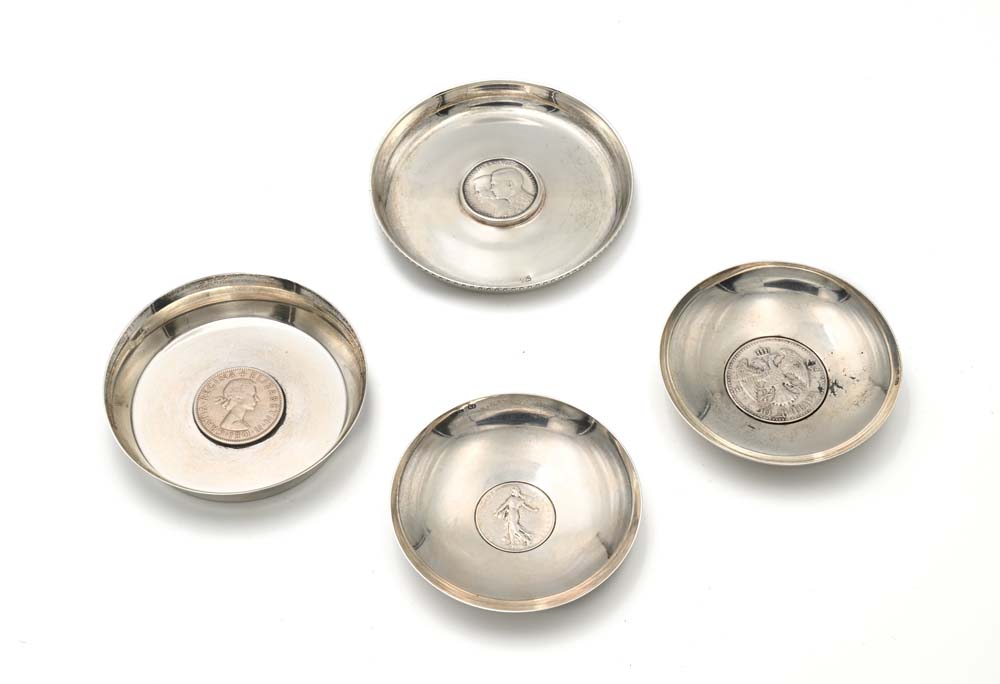 4 Piattini in argento 800/000 e 925/000 con al centro: 2 Franchi 1912 Terza Repubblica Francia; 50 Dinara 1932 Alessandro I Jugoslavia; 30 Dracme 1964 Grecia Paolo I; Half Crown 1956 Elisabetta II Gran Bretagna Peso complessivo 213 grammi