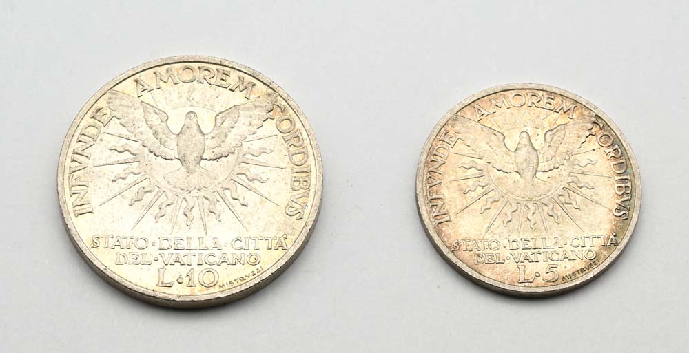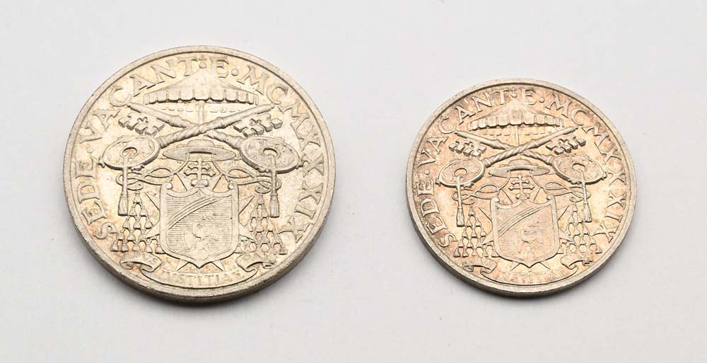 Precedente Lotto 647 Successivo Casa d'Aste Arcadia - Corso Vittorio Emanuele II 18, 00186 Roma Numismatica Numismatica lunedì 26 maggio 2025 ore 14:00 (UTC +01:00) 5 e 10 lire 1939 Sede Vacante Città del Vaticano 5 e 10 lire 1939 Sede Vacante Città del Vaticano