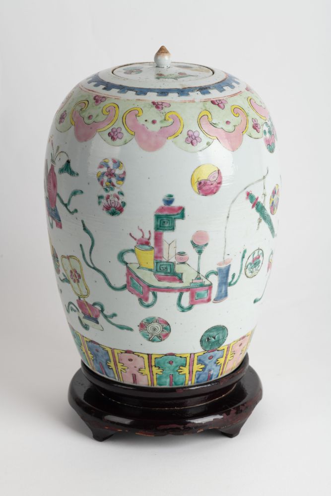 Giara da zenzero in porcellana dipinta a smalti policromi e decorata con oggetti del letterato Cina, fine perioo Qing (1644-1912)