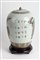 Alt.: 31 cm Giara da zenzero in porcellana dipinta a smalti policromi e decorata con vaso arcaicizzante ricolmo di fiori. Iscrizione in bella calligrafia sul retro. Fascia a foglie di platano stilizzate sulla base e banda superiore a teste di scettro ruyi.