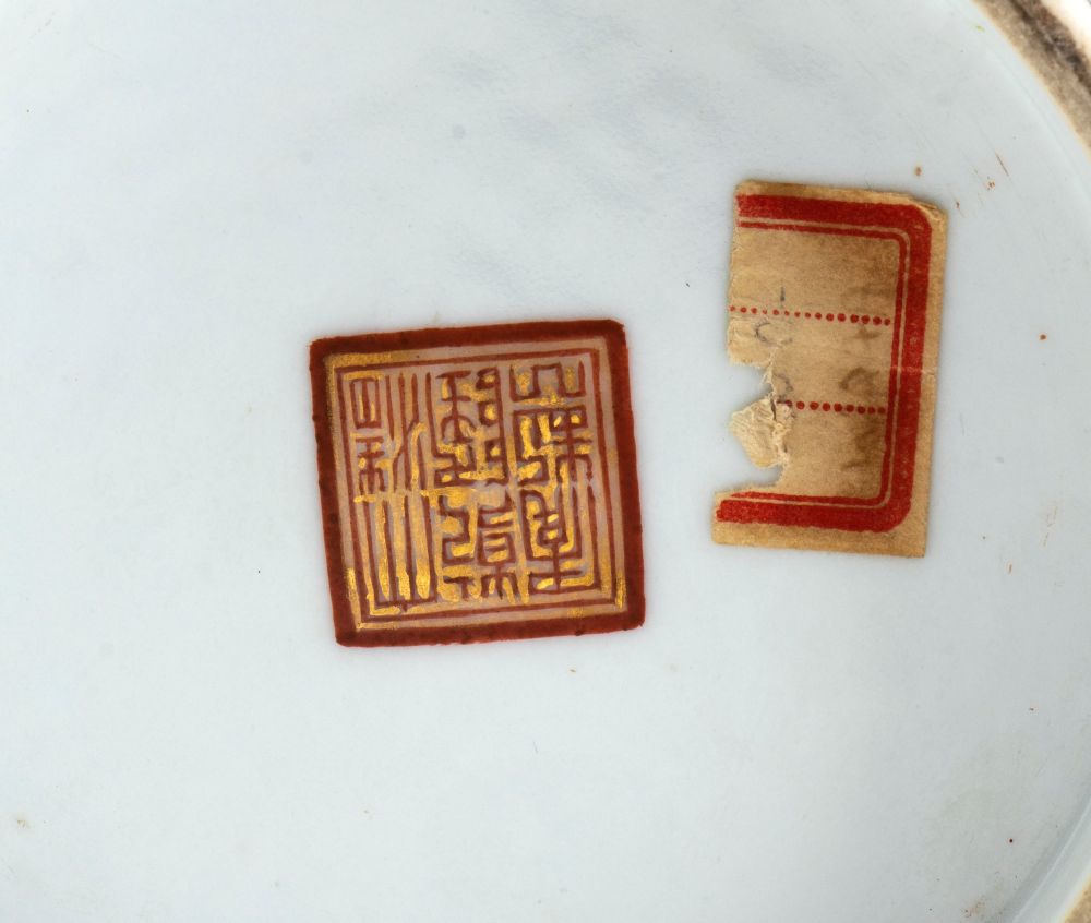 Alt.: 33 cm Su una parte del vaso è raffigurata una scena all’aperto con figure impegnate in un evento culturale, con due anse di colore rosso e dorato a forma di cane. Sull’altra parte è decorato con una poesia: 母奇熱中興元老,畧兼優安有道名,震拳夷富三位,隆師保,多五福,貴寿考 , Mu Qi Re.