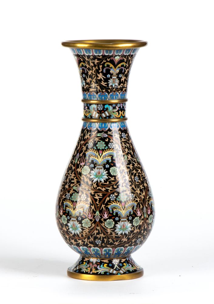 Alt.: 38 cm Vaso in rame decorato a smalti cloisonné con fiori di loto indiani su uno sfondo a racemi vegetali fogliati.
