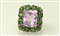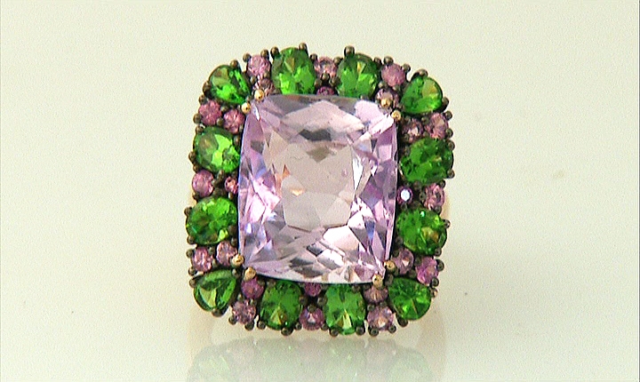 ANELLO. In oro rosa 18 kt con kunzite taglio cuscino di cts. 13,50 ca. entro giro di zaffiri rosa taglio rotondo per tot. cts. 0,90 ca. e granati verdi taglio goccia.