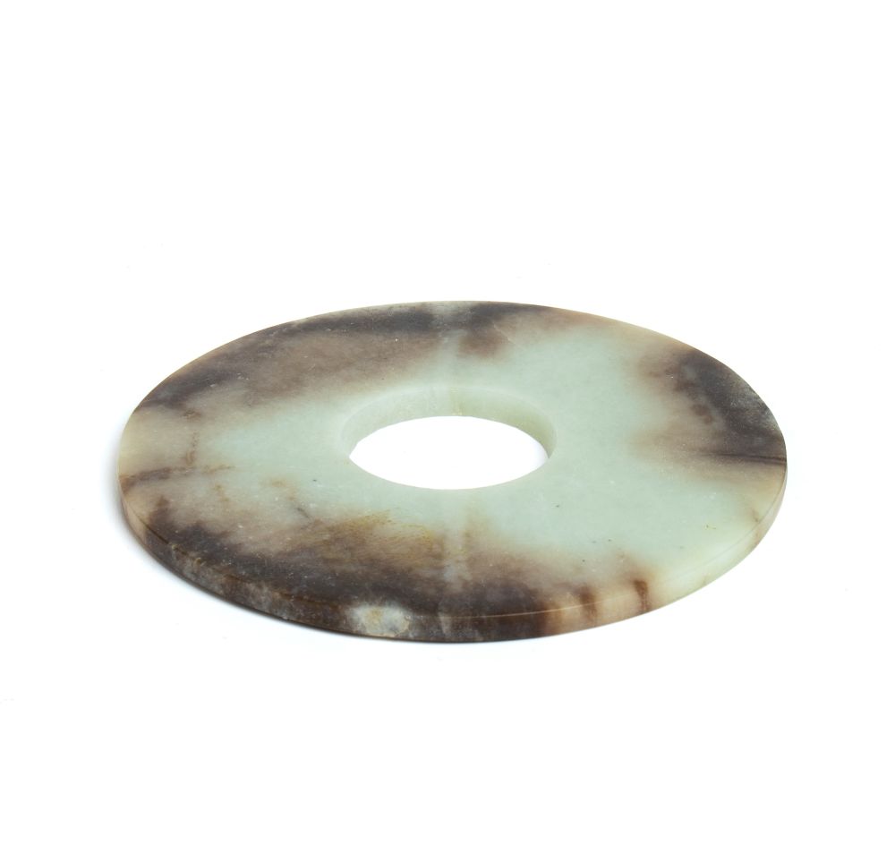 Diametro: 14 cm Bel disco Bi in giada trasparente con screziature cromatiche scure. Cina, tardo-neolitico, inizi Età del Bronzo Qijia, 2200-1600 a.C.