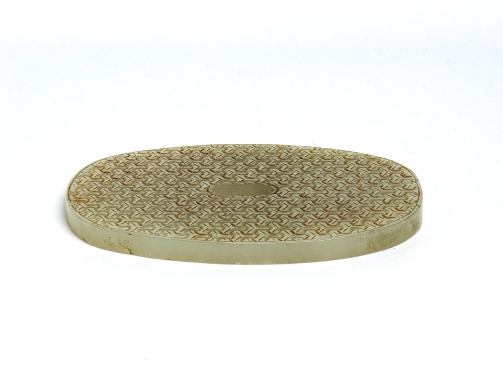 9,8 x 8,5 cm Giada ornamentale a forma leggermente ovale decorata su ambi i lati con elegante decoro geometrico costituito da motivi a "Y" interconnessi tra loro.