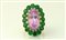 ANELLO. In oro giallo a fiore con al centro kunzite taglio ovale di cts. 12,50 ca. entro cornice in smeraldi taglio rotondo per tot. cts. 4,40 ca. e diamanti taglio brillante per tot. cts. 0,40 ca.