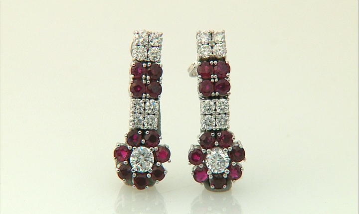 COPPIA DI ORECCHINI. In oro bianco 18 kt perno e farfalla a settori verticali terminanti a fiore con diamanti taglio brillante per tot. cts. 1,50 ca. e rubini taglio rotondo per tot. cts. 2,50 ca.