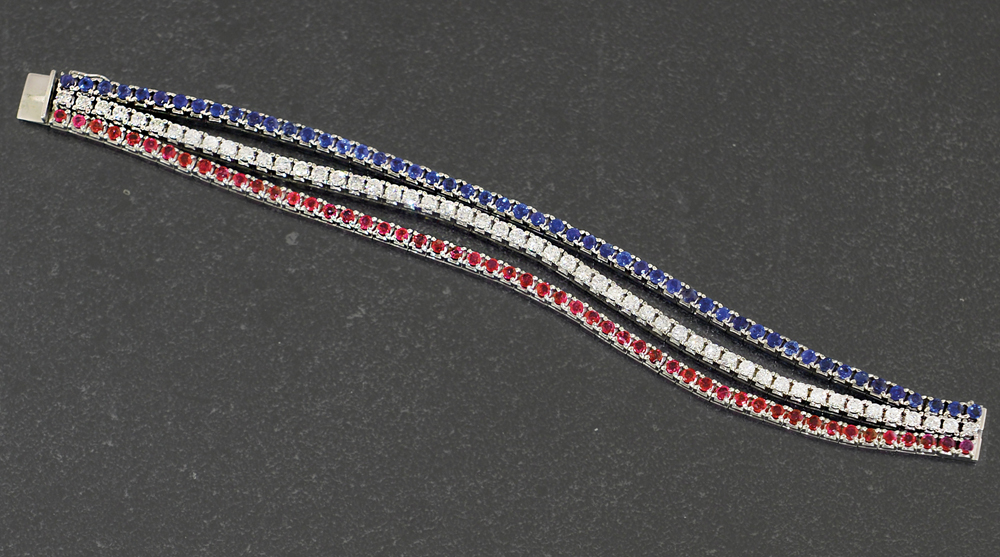 BRACCIALE. In oro bianco 18 kt a tre fili tennis, diamanti taglio brillante per tot. cts. 4,00 ca., rubini e zaffiri taglio rotondo per tot. cts. 9,00 ca.