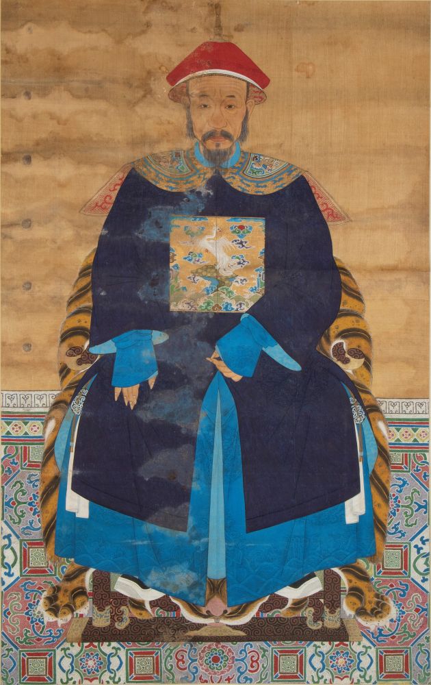 Lotto 120 | Dipinto su seta di dignitario in trono Cina, dinastia Qing (1644-1912), XVIII secolo 160 x 100 cm