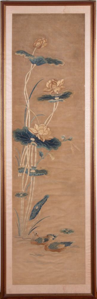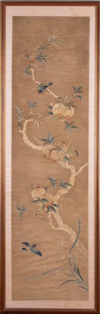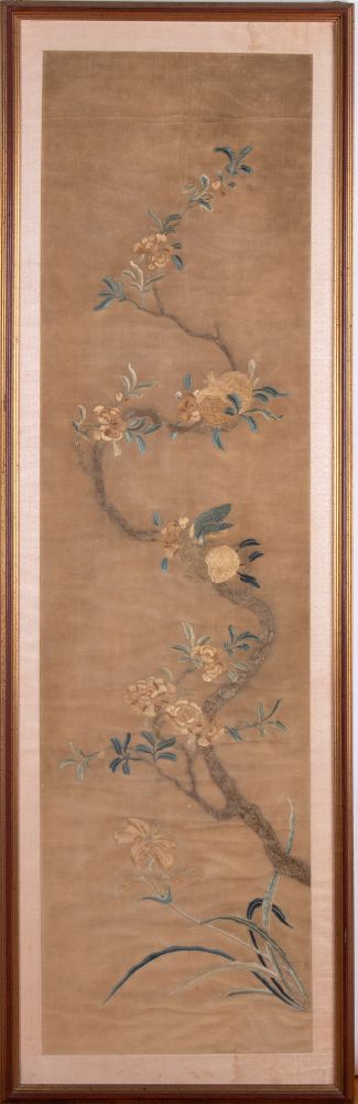 43 x 140 cm Quattro dipinti a tempere su carta minhwa con rappresentazione di piante fiorite ed uccelli.