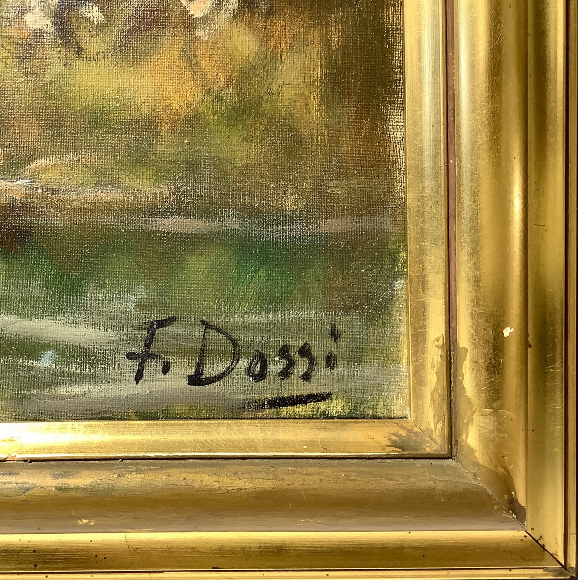 Paesaggio campestre con personaggi Cm 70x100, in cornice cm 88x118 Dipinto ad olio su tela Firmato in basso a destra F. Dossi.