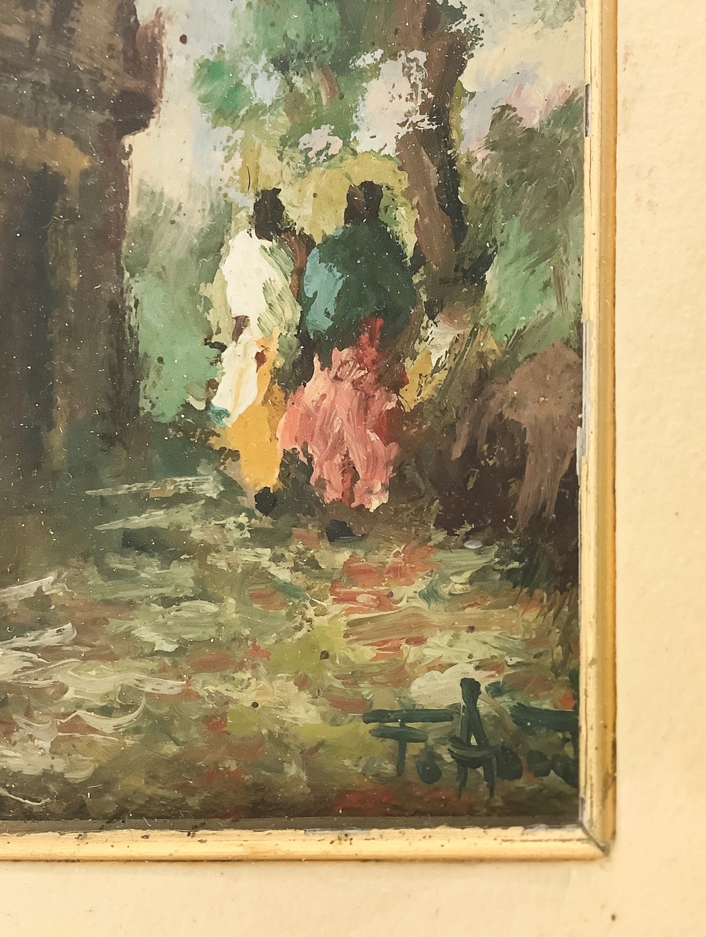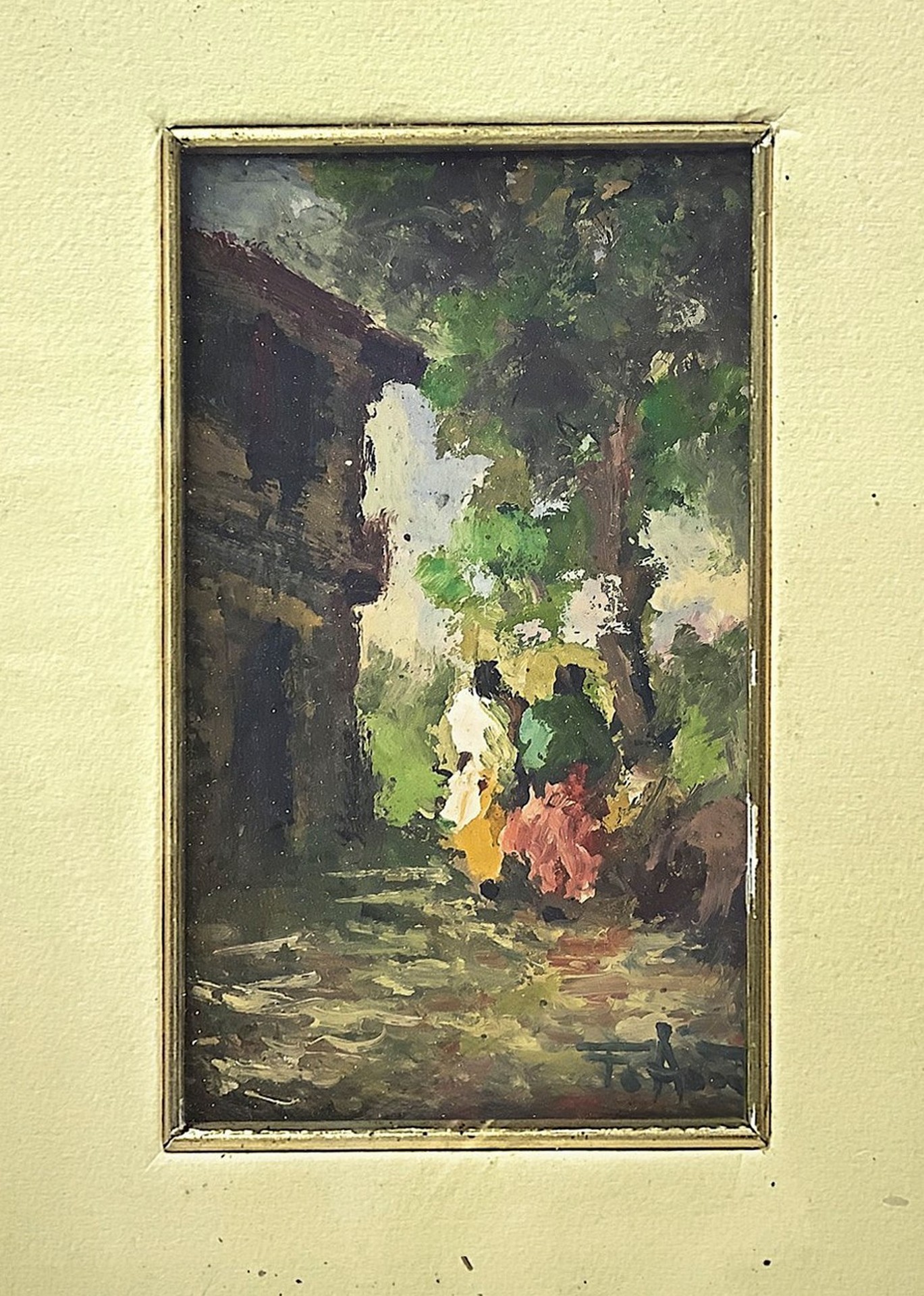 Dipinto raffigurante paesaggio campestre con case e personaggi, 19° secolo H cm 31 x 25,5; 15 x 9 Pittore Italiano di fine XIX Secolo. Firmato in basso a sinistra F.Nannini Pittore Italiano di fine XIX Secolo. Firmato in basso a sinistra F.Nannini