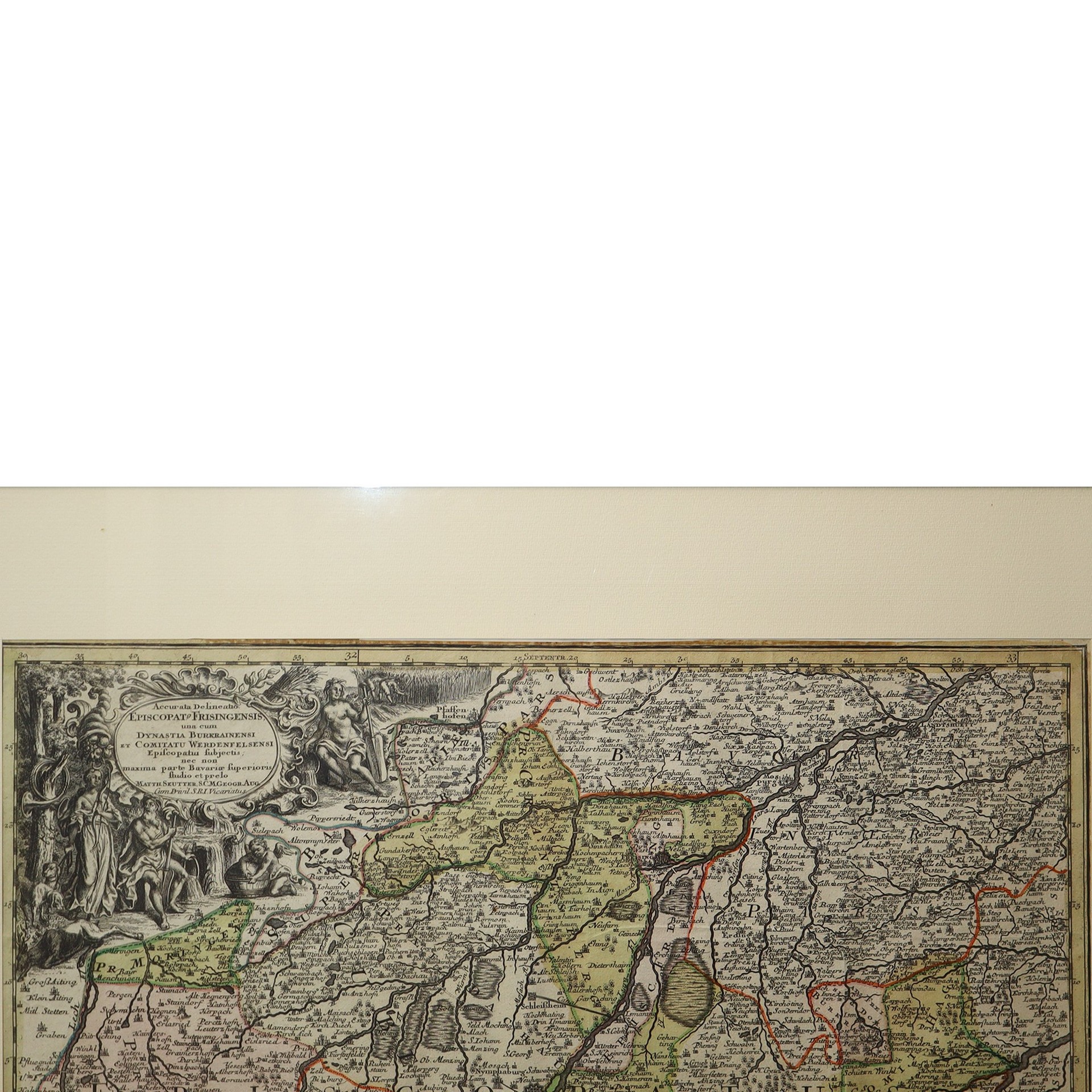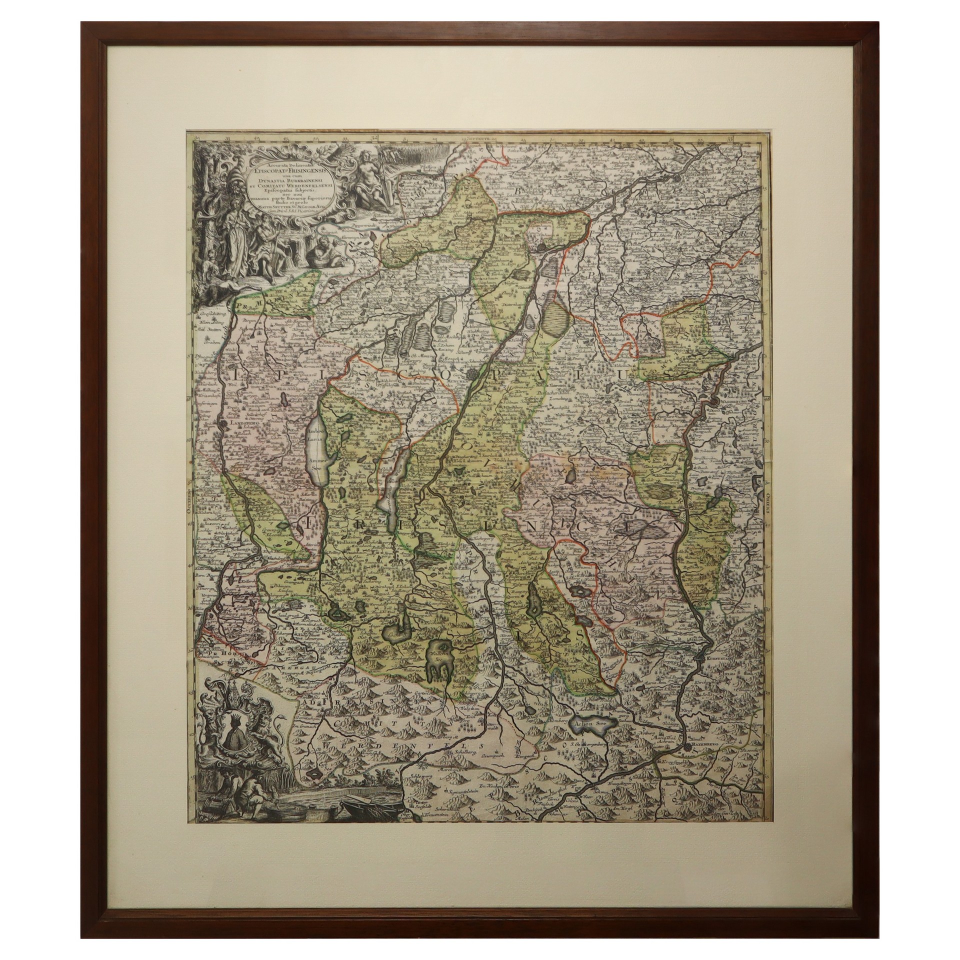 Matthaus Seutter (1678 - 1757) - Accurata delineatio episcopatus Frisingensis: una cum dynastia Burkrainensi et comitatu Werdenfelsensi episcopatui subjectis nec non maxima parte Bavariae superioris/studio et prelo Matt.Seutter, 18° secolo h mm 160X485 in cornice h cm 73X66