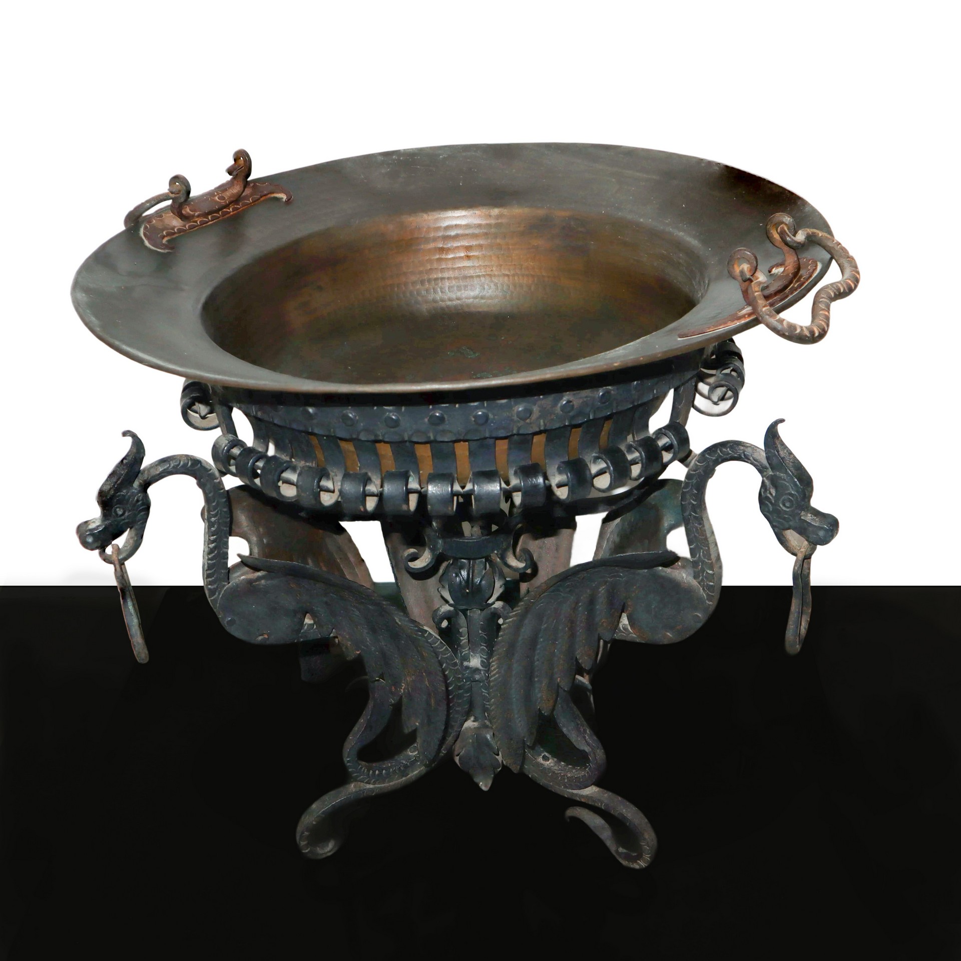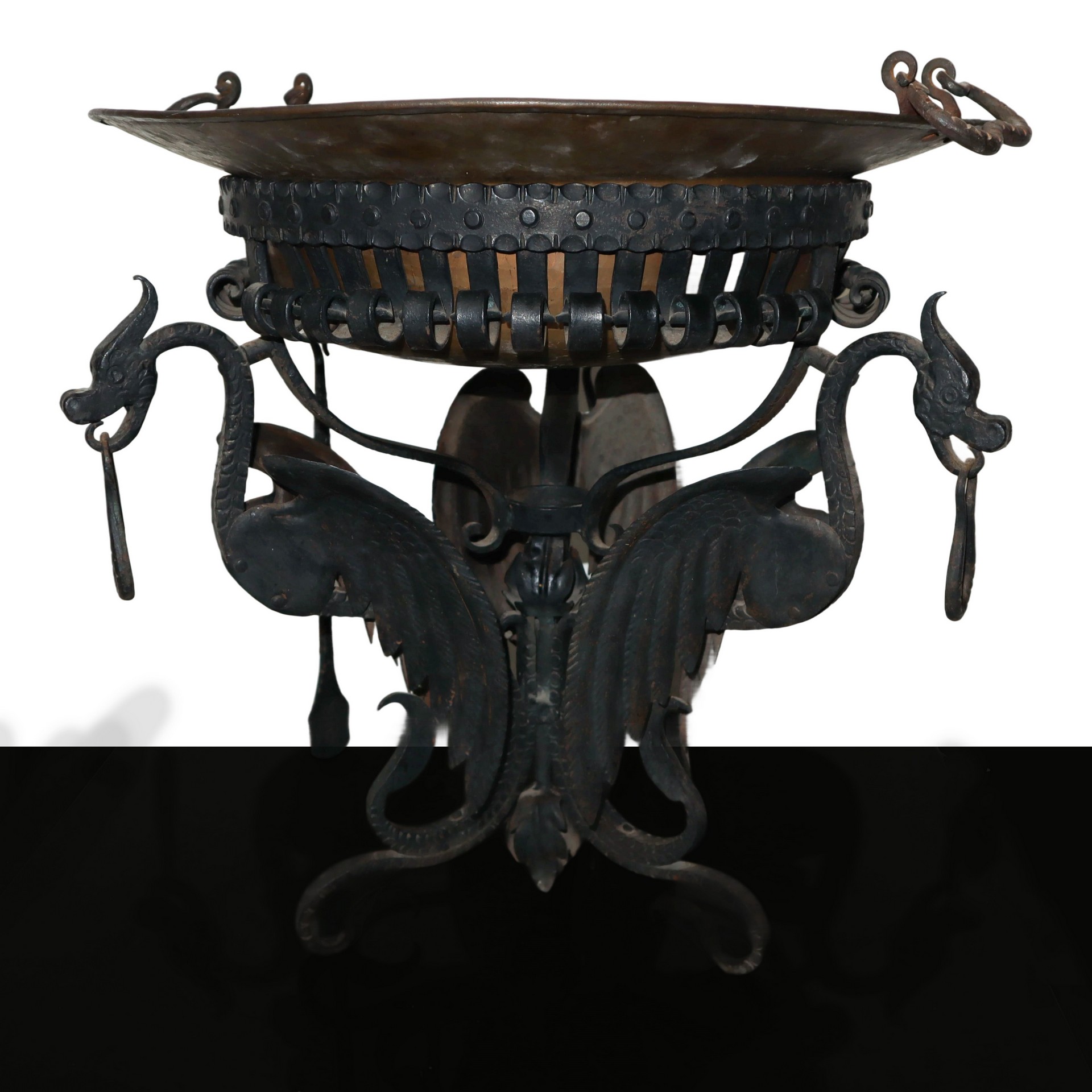 Braciere in ferro battuto con tre volatili di sostegno con paletta